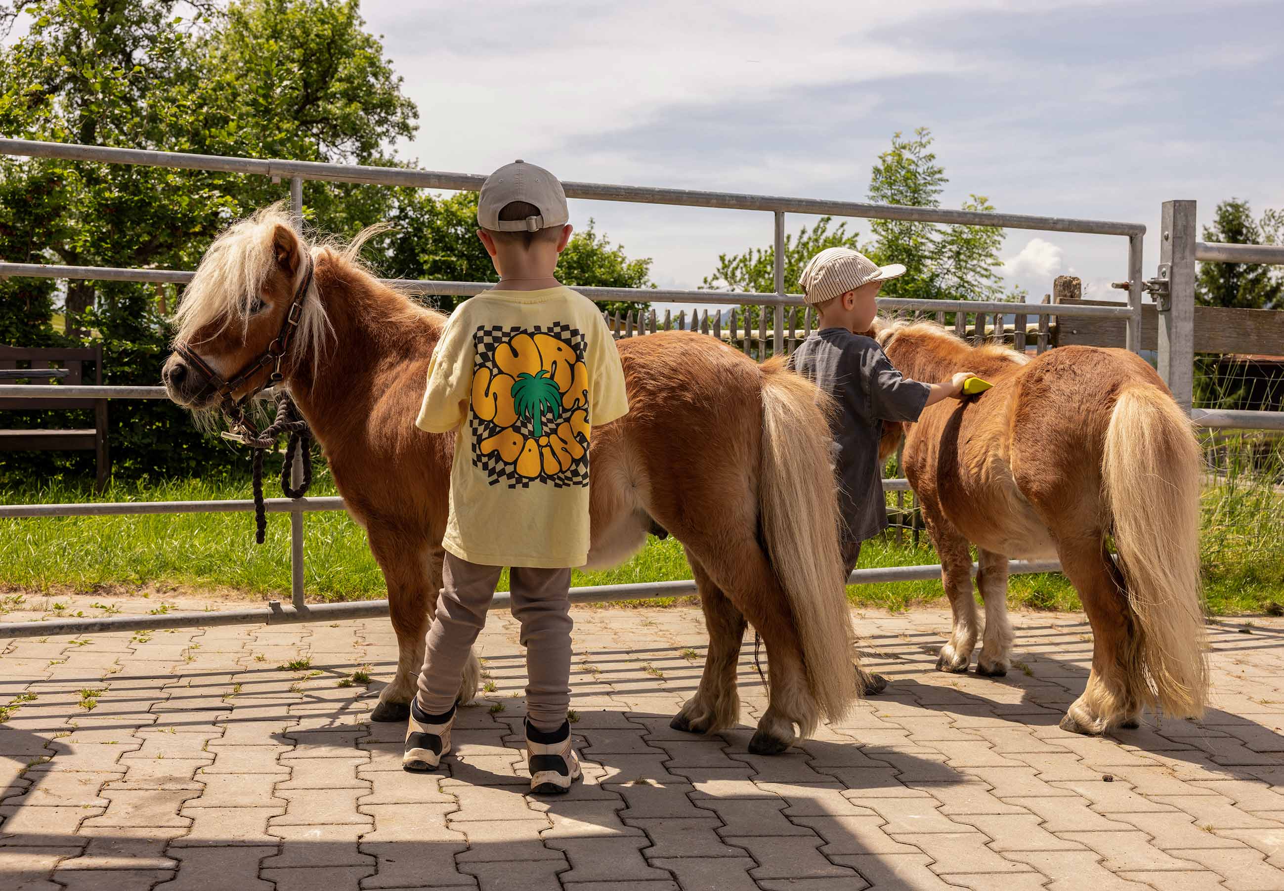 Unsere Minishetlandponys Pirmin und Pronto sind die Stars des Hofes. Sie freuen sich über Fellpflege und dürfen gerne täglich zur Stallzeit gestriegelt werden.