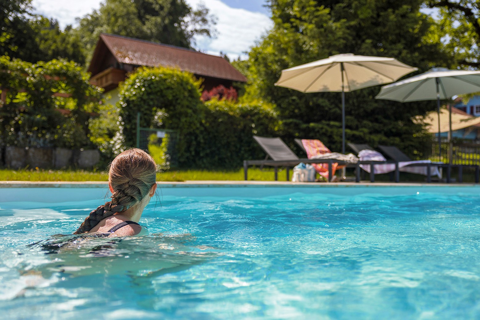 Unser auf 25 °C beheizter Salzwasserpool lädt von Anfang Mai bis Ende September zum Schwimmen und Planschen ein. Ob sportliche Bahnen ziehen oder einfach auf der Liege entspannen – hier findet jeder seinen Lieblingsplatz am Wasser. Bitte bringen Sie Ihre eigenen Badetücher mit. Falls Sie keine dabei haben, können Sie gegen eine Gebühr Badetücher bei uns ausleihen.
