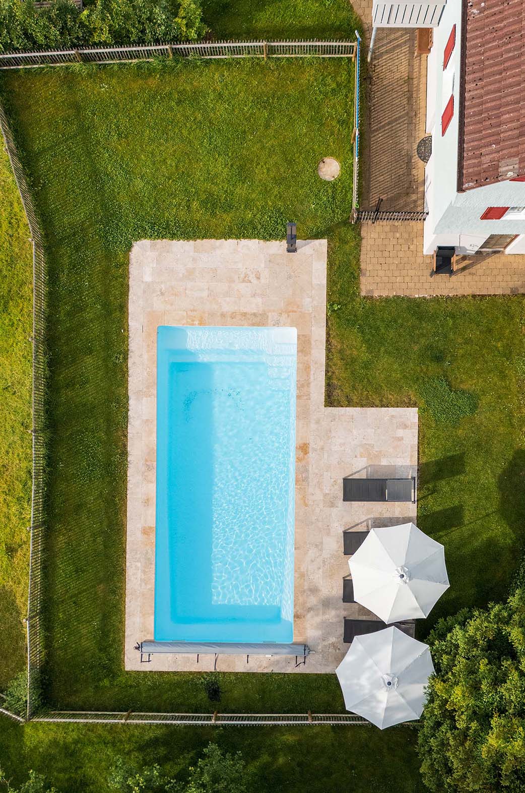 Unser auf 25 °C beheizter Salzwasserpool lädt von Mai bis Oktober zum Schwimmen und Planschen ein. Ob sportliche Bahnen ziehen oder einfach auf der Liege entspannen – hier findet jeder seinen Lieblingsplatz am Wasser. Bitte bringen Sie Ihre eigenen Badetücher mit. Falls Sie keine dabei haben, können Sie gegen eine Gebühr Badetücher bei uns ausleihen.