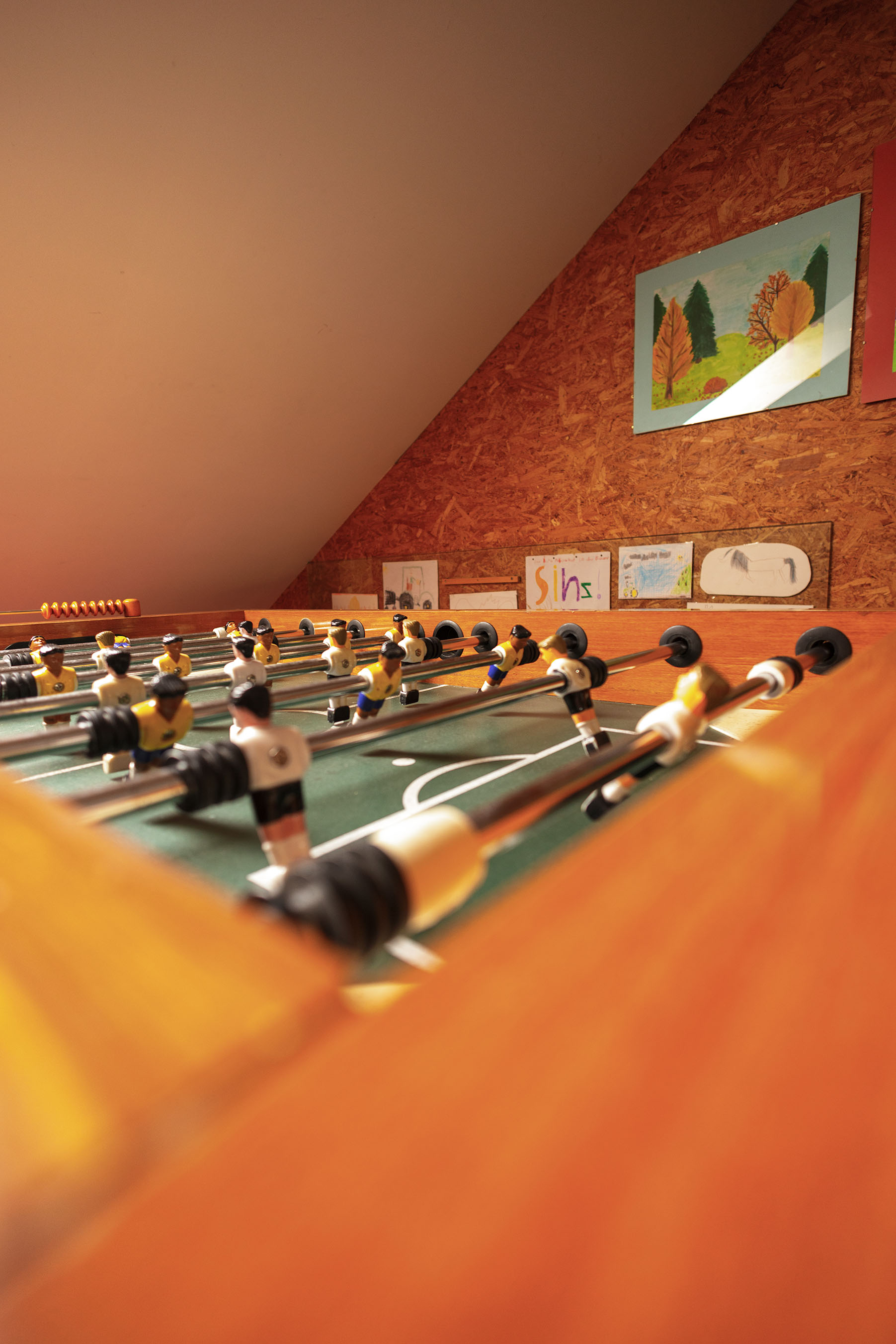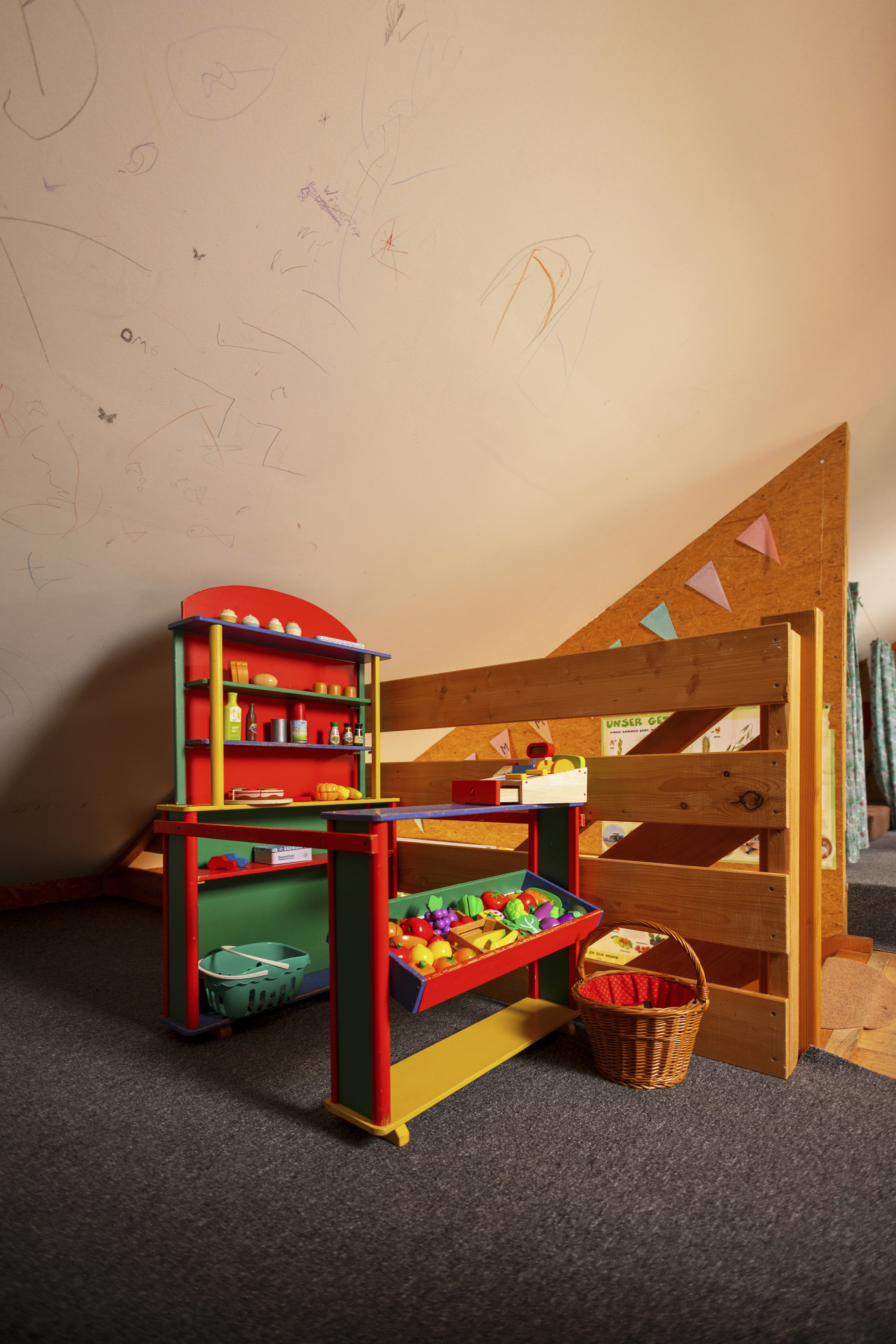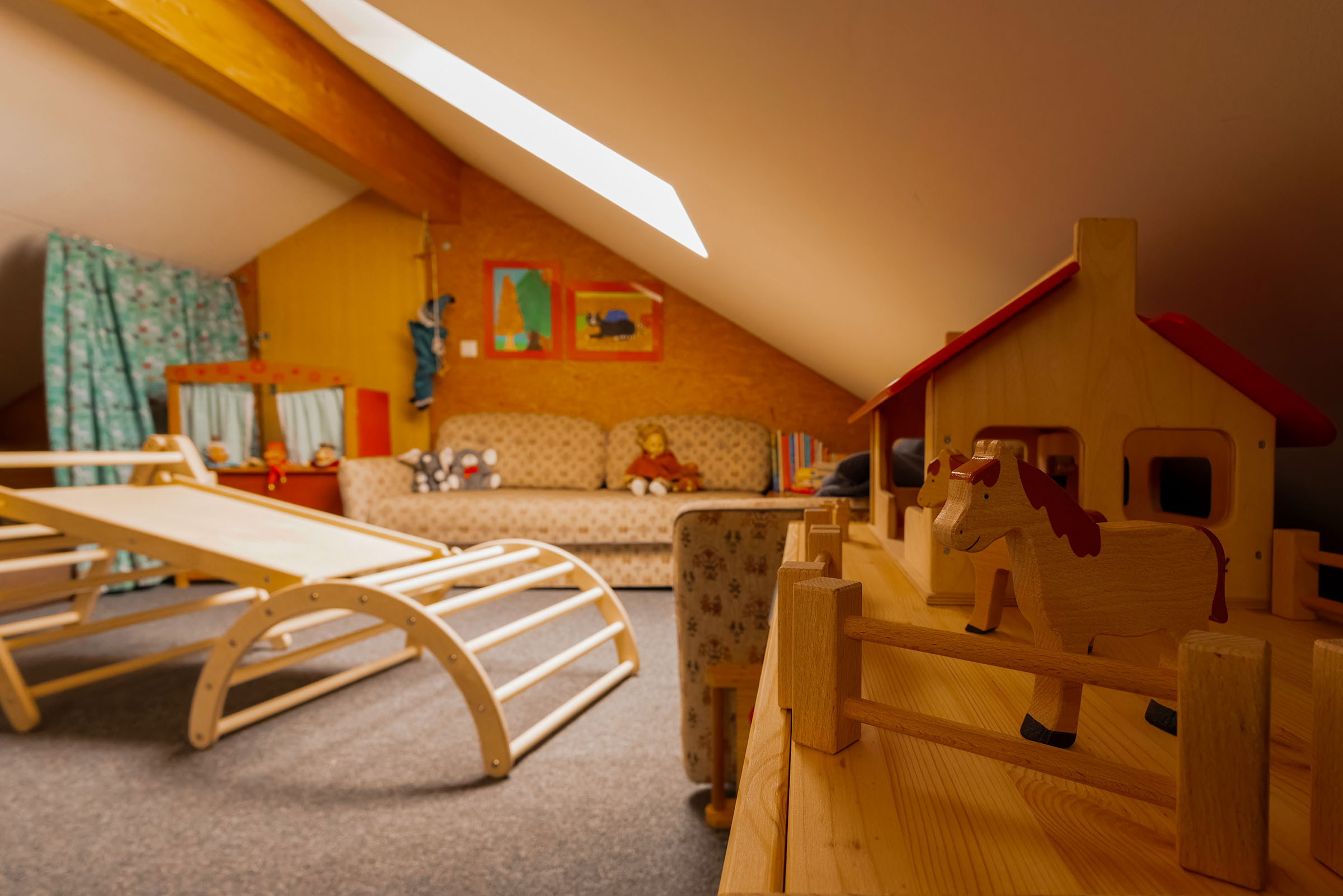 Manchmal darf es auch drinnen gemütlich sein: Im Spielzimmer, eine Etage über der Hirschbergstube, gibt es alles, was Kinderherzen erfreut – Tischkicker, Matratzenlager, Kasperletheater und Spielzeugbauernhof. Hier wird es garantiert nie langweilig.